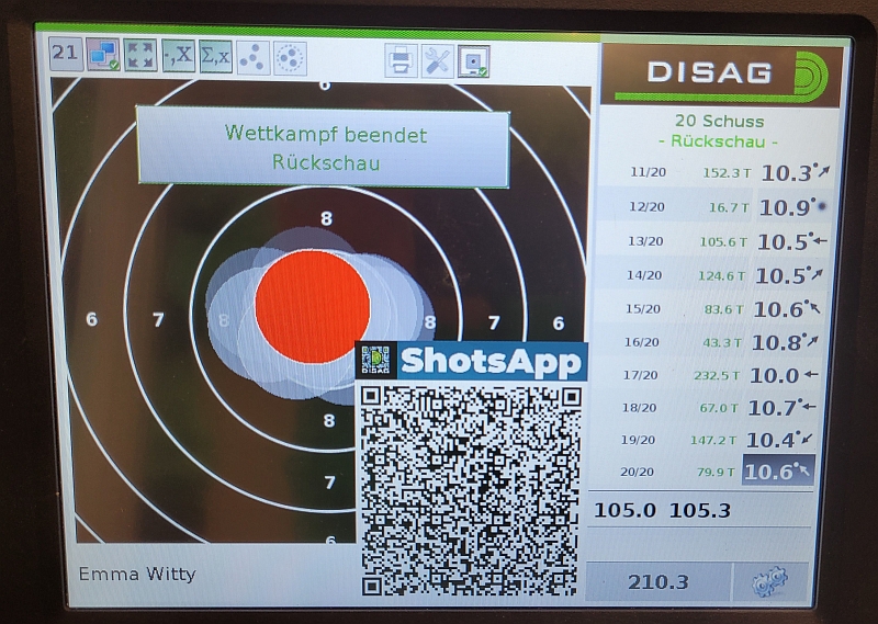 Emma Witty mit unglaublichen 210,3 Ringen auf Platz 1 - 33 Schüsse - 33 Zehner.
